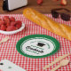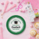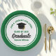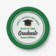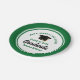 These modern green and white custom graduation party plates feature classy typography of your university or college name for the class of 2025. Customise with your graduating year next to the chic handwritten script and black grad cap for great personalised congratulations graduate party decor.