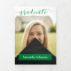 Elegant script announces your graduate over your favourite senior photo on the front. Block for their name on the front, and all the ceremony details inside along with two more pictures. Space on the back for a thank you message to friends and family. Design available in school colours of red, orange, purple, green, blue, burnt orange, maroon, and black. Matching products available.