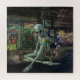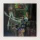 This colorful, yet dark and surreal image depicts a green, grey alien with large dark eyes, sitting on the pavement. His legs and one hand on the street that looks like dark water. On his right side a tiny little man sitting and on his left side a glass holding paint brushes next to a face drawing. Behind the alien, an old lady holding a bag, walks along the wall that is full of graffiti