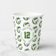 These volleyball themed birthday party paper cups feature multiple small green, grey & white volleyballs arranged in a simple drop pattern - text on a white circle graphic can be customised, currently 12 to represent a child's age encircled by the words, "Happy birthday" - by katz_d_zynes
