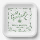 Be proud, rejoice and showcase this milestone of your favorite grad! Celebrate with this quirky, whimsical, simple, modern, custom paper plate. Fun hunter green handwritten script typography and hand drawn graduation icon sketch doodles overlay a clean white background. Personalize the custom text with your graduate’s name and class year or special message. Available in 2 sizes: 7” square or 9” square. Matching invites, thank you cards, hand fans, banners, yard signs and other graduation goodies are also available in this trendy and playful collection. Guaranteed to add stylish fun to their special party!