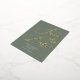 Elegant save the date postcard featuring hand written calligraphy text in gold on an olive green background.