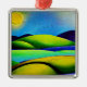 Digital watercolor landscape design in vibrant shades of blue, green, and yellow with a sun and birds.