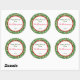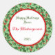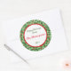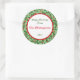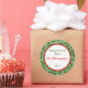 Editable gift stickers with red and green vintage letters on a holiday pattern of green holly with bright red berries.