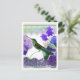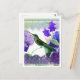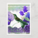 A beautiful iridescent green hummingbird perched on a delicate plant stem, surrounded by purple and blue flowers, including Hydrangeas, bordered by multi-colour crystals, seafoam green pearls and purple lace design elements.
