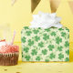 Wrapping paper featuring a pattern of three leaf clovers in two shades of green on a lighter background. Fun design, perfect for St Patrick's day.