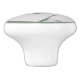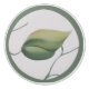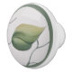 A lovely green leaf decorates this ceramic know. It is surrounded by a green border. It has a cream coloured background and tiny green vine stems complete the image.