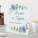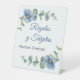 Guide your guests with elegance using this baptism pedestal sign. Adorned with watercolor green leaves and pretty blue flowers, this sign adds a touch of sophistication to your event while directing guests to the designated area for 'gifts and cards'.