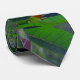 With the look of a retro tropical fabric design, the original photograph by MaeFlowers on this Tie is a closeup of green leaves with their linear detail and graceful curves. Some of the leaves catch the light in ways that add hues of rust and purple. The background of the photo is a blur of soft greens. The photo is repeated along the tie, with black bands in between.