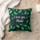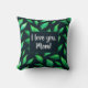 Love Mum Mother's Day pillow with a dark botanical pattern created from a mixed media ink and digital painting of abstract green leaves with light green veins over dark green, almost black, background. This leafy pillow for nature lover mum features the customisable text "I love you, mum".