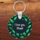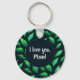 Love Mum Mother's Day keychain with a dark botanical pattern created from a mixed media ink and digital painting of abstract green leaves with light green veins over dark green, almost black, background. This leafy keychain for nature lover mum features the customisable text "I love you, mum".