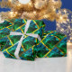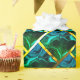 Traces and green curves with alterations of shades that may seem emerald, with lines stained in yellow and gold colors that simulate splices. The colors of the lines around the squares can cause a perception of gold metallic ribbons, or some sort of grid over green. The green of the squares change from a dark shade at the top to the lightest at the bottom, this effect added to the contrast of the lines can cause the illusion that the squares are a bulky cloth trapped in a grid or mesh; depending on the position you observe, ambient lighting or personal perception.