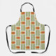 This apron has a mid-century modern design made of five green lines and a gold rounded rectangle with an orange rounded rectangle repeated across the design.