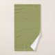 This towel set has an orange washcloth, a green hand towel, and a bath towel with a mid-century modern design made of five green lines and a gold rounded rectangle with an orange rounded rectangle repeated across the design.