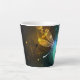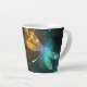 Flight of glowing, green, artistically drawn dragonfly with transparent green and yellow wings on glowing night background with marsh plants and fireflies. Glowing dragonfly.