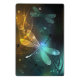 Flight of glowing, green, artistically drawn dragonfly with transparent green and yellow wings on glowing night background with marsh plants and fireflies. Glowing dragonfly.