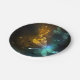 Flight of glowing, green, artistically drawn dragonfly with transparent green and yellow wings on glowing night background with marsh plants and fireflies. Glowing dragonfly.