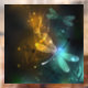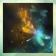 Flight of glowing, green, artistically drawn dragonfly with transparent green and yellow wings on glowing night background with marsh plants and fireflies. Glowing dragonfly.