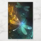 Flight of glowing, green, artistically drawn dragonfly with transparent green and yellow wings on glowing night background with marsh plants and fireflies. Glowing dragonfly.