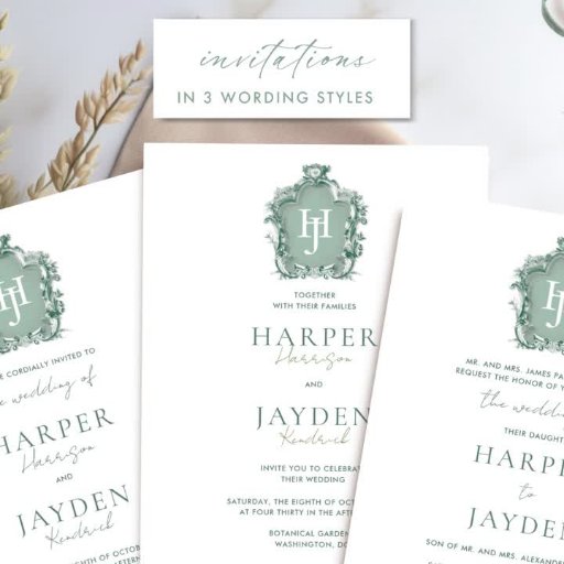 Celebrate your love with our exquisite, timeless elegance wedding invitation, where classic sophistication meets modern charm. This invitation features a beautifully ornate monogram in lush green tones, centred with a pale green background highlighting the couple’s initials. The design exudes timeless elegance, complemented by stylish wording in a blend of delicate handwritten calligraphy and classic typography. The back features a delicate and romantic watercolor scene in green hues, framed by a stunning ornamental arch doorway, where couples can choose to include their monogram initials. Part of our "Timeless Elegance Green" collection, this invitation pairs seamlessly with matching suite items and event stationery. Romantic, elegant, and unique. This template is easy to use and designed for couples who desire a wedding invitation that is as memorable as their love story. Available with three other back options.