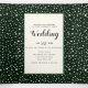 Green mountains and conifer trees trifold winter wedding invitation. A lovely elegant wedding invite featuring a green and white mountain range through conifers and your names in handwritten style on the cover. Your wedding text and details are in the inside panels in white frames with snow behind on dark green. The back features a photo of the couple with their initials while the flap includes the date of your wedding.
