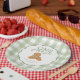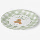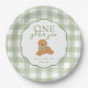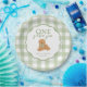 Celebrate your little one's One Golden Year in sweet puppy style with this round paper plate. A green gingham border surrounds a scalloped center that features a hand drawn Goldendoodle puppy and editable text for your little one's name and first birthday date. Perfect for cake slices, snacks, and photo ready table settings at any Goldendoodle themed party.
