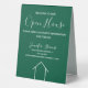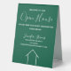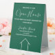 This modern green and white Open House table top sign is custom made with your realty company name and realtor contact details. Impress new home buying clients with this chic, simple signage with this classy typography sign. A minimalist line drawing of a house sits under the real estate agent information.