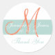 Use these beautiful Mint Green Orange Monogram Names Wedding Thank You Stickers to label your wedding favours. Design by Elke Clarke© for the Monogram Gallery. This design is simple, yet classic and fits with any wedding theme. THE MONOGRAM GALLERY allows you to customise the names, monogram and colours of the text. Just click on the "CUSTOMIZE" button and follow the prompts. Need a different colour ribbon? Contact designer. Perfect for a spring and summer wedding.