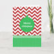A green ornament, with customisable text, is on a red and white chevron stripe background. The bottom part is green with polka dots, and is separated by a green striped 'ribbon' from the chevron pattern.