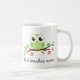 Cute teacher appreciation cup featuring a little green cartoon owl sitting on a branch with green leaves and red flowers. Customisable text: "Best teacher ever". The text can easily be changed to for example the teachers name.