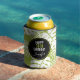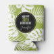 A can cooler with a repeating pattern of large palm leaves on an olive green background. Trendy modern and tropical.