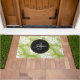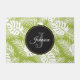 Monogram doormat with a repeating pattern of large palm leaves on an olive green background. Trendy modern and tropical. A black circle with a gold inner border layered over top with your personalised details inside.