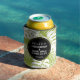 Wedding can coolers with a repeating pattern of large palm leaves on an olive green background. Trendy modern and tropical. A black circle with a gold inner border layered over top with your personalised details inside.