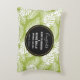 A wedding pillow with a repeating pattern of large palm leaves on an olive green background. Trendy modern and tropical. A black circle with a gold border layered over top with your personalised details inside.
