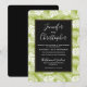 A wedding invitation with a repeating pattern of large palm leaves on an olive green background. A black frame with a gold coloured border layered over top with your personalised text inside.