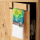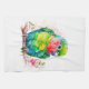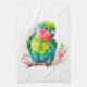 Kitchen towel with a cute parrot illustration. A little green parrot with blue and yellow colours blending together. Neck has a vibrant shade of reddish pink.