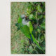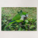 Wild green parrot on the green bush in a park in Spain. Also known as the Monk parakeet or Quaker parrot