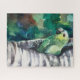 Green parrot peeking out of its hole, watercolor painting, puzzle