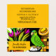 Whimsical green parrot drawing. Funny amazon parrot wit pink tulips, a panama hat and bright orange, yellow and brown hues.. Colourful and happy business card!