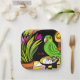 Whimsical green parrot drawing. Funny amazon parrot wit pink tulips, a panama hat and bright orange, yellow and brown hues.. Colourful and happy business card!