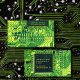 Detailed photograph of a pcb board. Printed circuit's main colour: green... Modern unica one font.