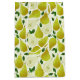 A pattern of vibrant green pears in shades of yellow and green with bright green leaves. Some of the pears are halved to show the juicy insides and seeds.