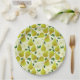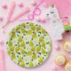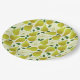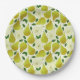A pattern of vibrant green pears in shades of yellow and green with bright green leaves. Some of the pears are halved to show the juicy insides and seeds.