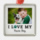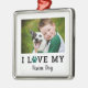 This modern holiday ornament for dog lovers features "I LOVE MY" wording in modern and bold black lettering with a forest green coloured animal paw print accent. Personalise the black script with the type of pet or the pet's name Add a favourite horizontal photo. White background colour.