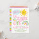 Sweet and colorful sunshine themed first birthday invitation featuring a cute sun, two rainbows, a cloud and some handwritten style text . This our little ray of sunshine first birthday invitation is a cute way to invite guests to a baby girl's colorful sunshine themed first birthday party.