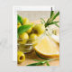 Glass cup with green pitted olives decorated with herbs and rosemary on the old wooden base with shallow depth of focus.