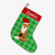 Bright green plaid and fox wearing Santa hat on personalised Christmas stocking.