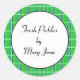 A custom canning sticker with a fresh green plaid pattern with small white and blue stripes for pickles, jams or other recipes.