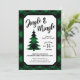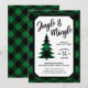 A festive 'Jingle and Mingle' holiday party invitation with a green and black buffalo plaid border and coordinating tree silhouette.