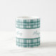 Lovely coffee mug with Merry Christmas in modern calligraphy with green plaid background.